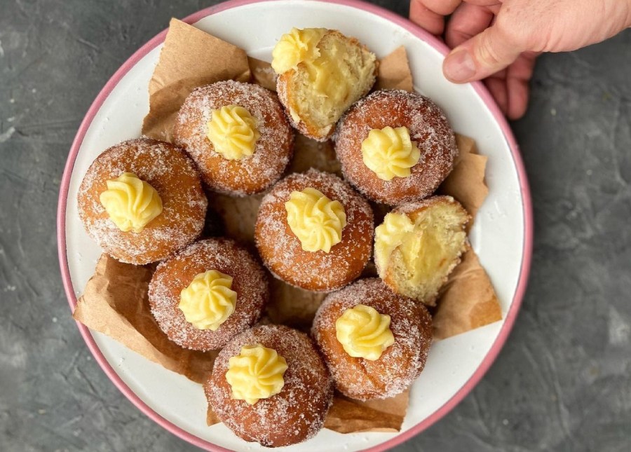 Dejar la masa descansar hasta que duplique. Desgasificar la masa y cortar las porciones. Hacer las bolitas y poner en la placa a duplicar. Una vez que haya pasado esto lo que te queda es freír en abundante aceite a 160º, capaz que hasta un toque menos. Así se inflan bien y cocinan parejo. Después de freírlas pasalas por azúcar y listo. Las podés rellenar de pastelera o dulce de leche.