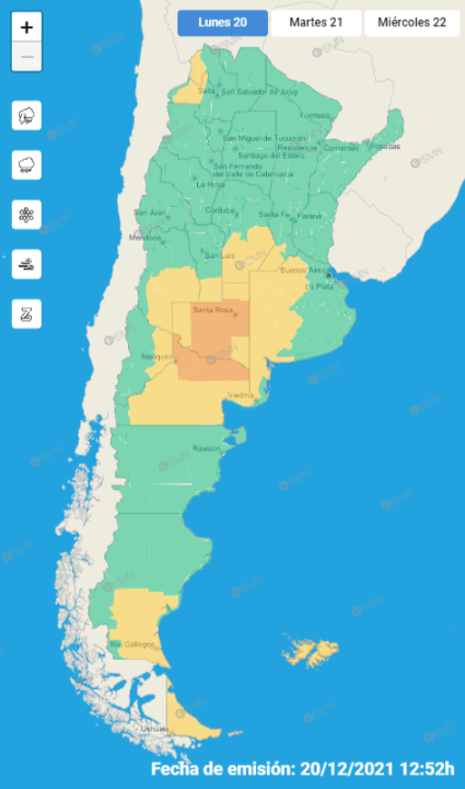 La misma información se dio en Río Negro para: Meseta de Pilcaniyeu – Meseta de Ñorquincó – Nueve de Julio – Oeste de El Cuy – Veinticinco de Mayo. Además, hay una zona que está bajo alerta naranja: Avellaneda – Pichi Mahuida.