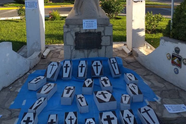 Colocaron unos 23 ataúdes pequeños con carteles que dicen: «Por los niños no nacidos asesinados en abortos». La protesta de se vio a inicios de la mañana, por lo que se habría preparado en la madrugada.