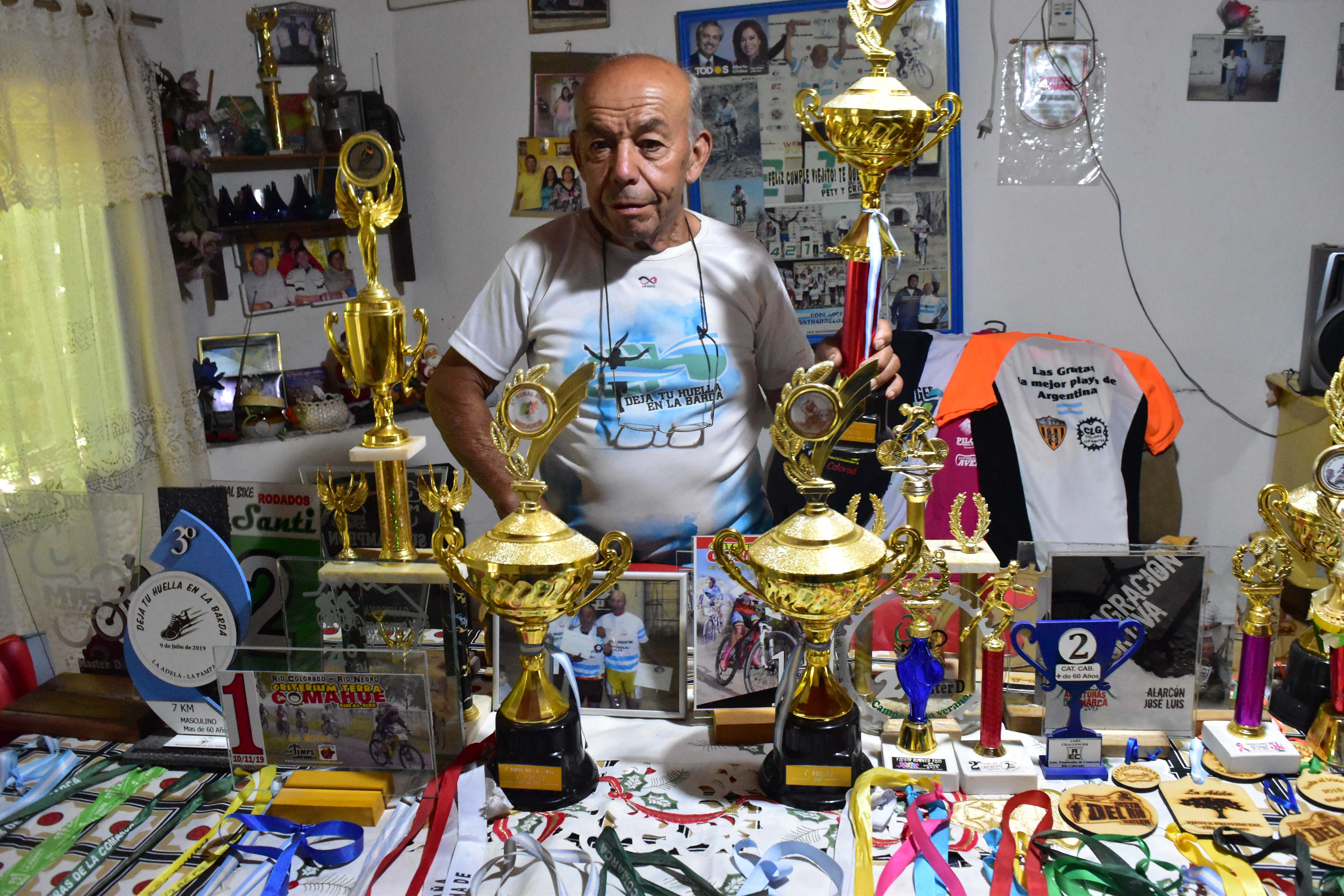 Con la sencillez que lo caracteriza, “el petiso”, antes de salir al entrenamiento diario, se prepara unos mates. Muestra con orgullo la incalculables cantidad de medallas, plaquetas, diplomas, camisetas, trofeos y fotos que están guardadas, casi apilados, por todos los muebles y rincones de la casa. Todos ellos certifican su larga trayectoria compitiendo sobre una bicicleta, en el ámbito local, provincial y nacional.