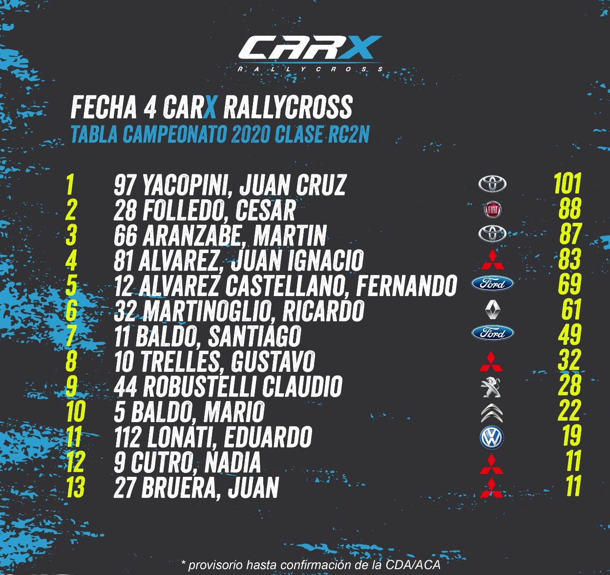 Yacopini suma 101 puntos y se convirtió en el gran favorito a quedarse con el título, si bien tanto César Folledo, a 13, como Martín Aranzabe, a 14, y JuaniÁlvarez, a 18, tiene muchas posibilidades de consagrarse campeones. El Top 5 lo completa Fernando Álvarez Castellano, quien está a 32.