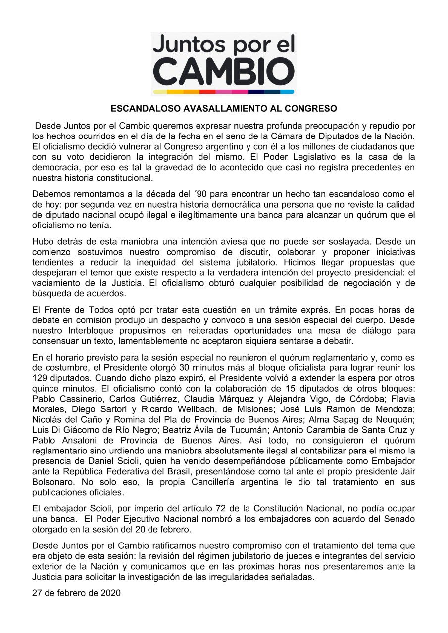 El interbloque de diputados de Juntos por el Cambio expresó su "repudio" y la "profunda preocupación" tras el aval obtenido en la Cámara Baja para la ley de jubilaciones de privilegio, que fue votada hoy en recinto con la participación de Daniel Scioli en la banca para habilitar el quórum de la sesión.