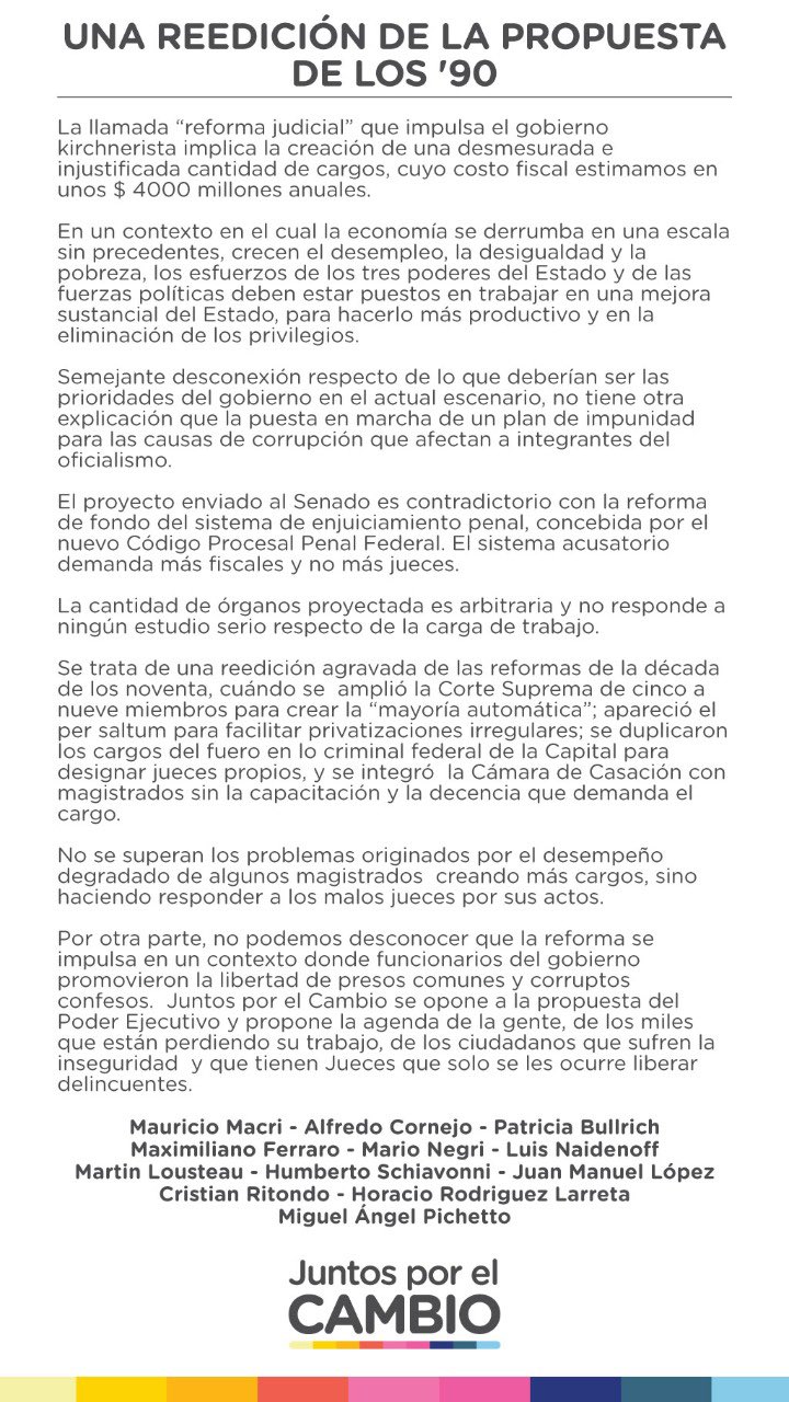 En un comunicado emitido al término de la reunión, los dirigentes de la alianza expresaron que «Juntos por el Cambio se opone a la propuesta del Poder Ejecutivo y propone la agenda de la gente, de los miles que están perdiendo su trabajo, de los ciudadanos que sufren la inseguridad y que tienen jueces que solo se les ocurre liberar delincuentes».