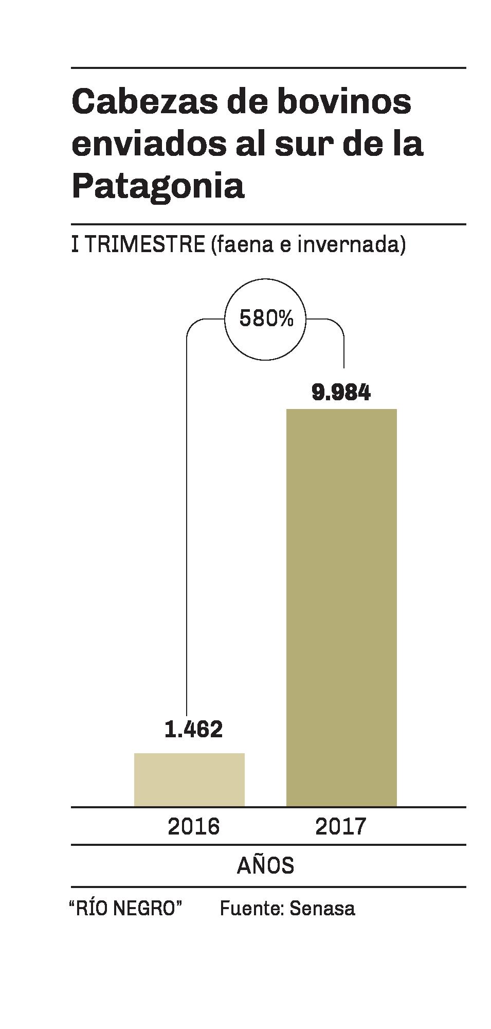 • Ganadería bovina. Los estudios del Senasa reflejan que el comercio ganadero mostró un positivo desarrollo en esta primera parte del año. La venta de hacienda desde la región hacia el sur de la Patagonia se sextuplicó en los primeros tres meses del 2017 y la faena en los establecimientos de Río Negro y Neuquén creció en un promedio de algo más de mil cabezas por mes. La mayor oferta de hacienda al mercado se da en un contexto con buen desarrollo de campos, lo que permitió tener una mayor carga por establecimiento, y la aparición de feed lot en toda la región. Pero los márgenes de rentabilidad para muchos sectores no crecieron. Este es el caso de la industria que faenó más hacienda pero con menores niveles de rentabilidad. Según fuentes allegadas a los sectores frigoríficos, “los valores de la hacienda en pie subieron, pero estos mayores costos no se pudieron trasladar a las góndolas ya que el consumo está en baja y el temor que existía era que si se incrementaban los precios la caída podía llegar a ser mayor”. En toda la cadena del sistema ganadero bovino existieron en estos últimos meses dos grandes ganadores. Uno de ellos fue el productor que pudo hacer valer la hacienda a la hora de negociar con la industria o de vender hacia los campos del sur de la Patagonia. El otro fue el consumidor que vio crecer tan sólo 5% el valor de la carne en góndola en el último semestre contra una inflación superior al 20%. Independientemente de este último dato hay que resaltar que desde diciembre del 2015 a la fecha el precio de la carne en los negocios minoristas casi se duplicó, lo que definió una sensible caída en el consumo, que es lo que se sigue viendo en estos días.