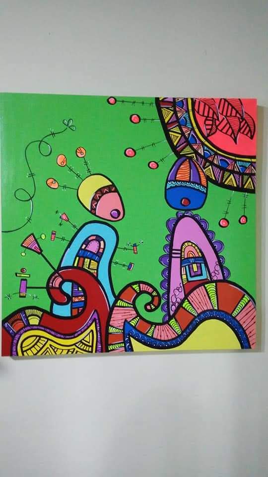 R: En mis obras hay un mundo de colores con personajes, que viven y conviven de manera plena entre si y el medio que habitan. Donde el respeto por la diversidad se hace presente .