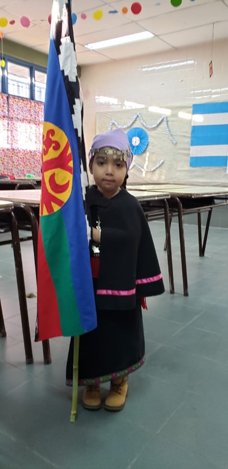 Newen Antu va a 4º grado y desde que se comenzó el nivel primario en esta institución empezaron a trabajar en la propuesta de interculturalidad, según explica su mamá Eli. Y en este día de la Bandera, Newen junto a sus compañeritos hacía la promesa.