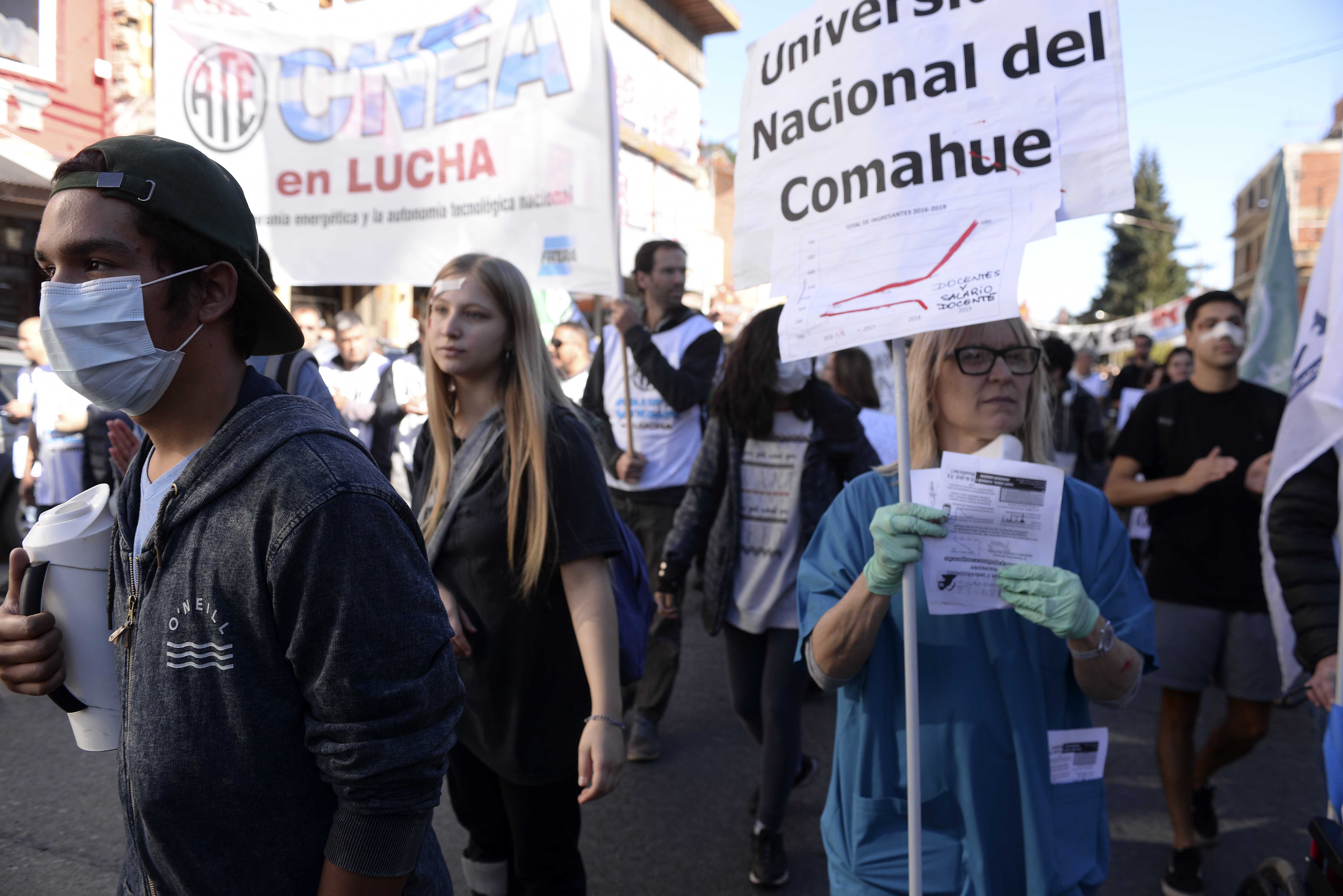 Los trabajadores del Centro Atómico Bariloche, Instituto Balseiro, Universidad de Río Negro y del Comahue, INTA, Agricultura Familiar, entre otros organismos formaron parte de la protesta.