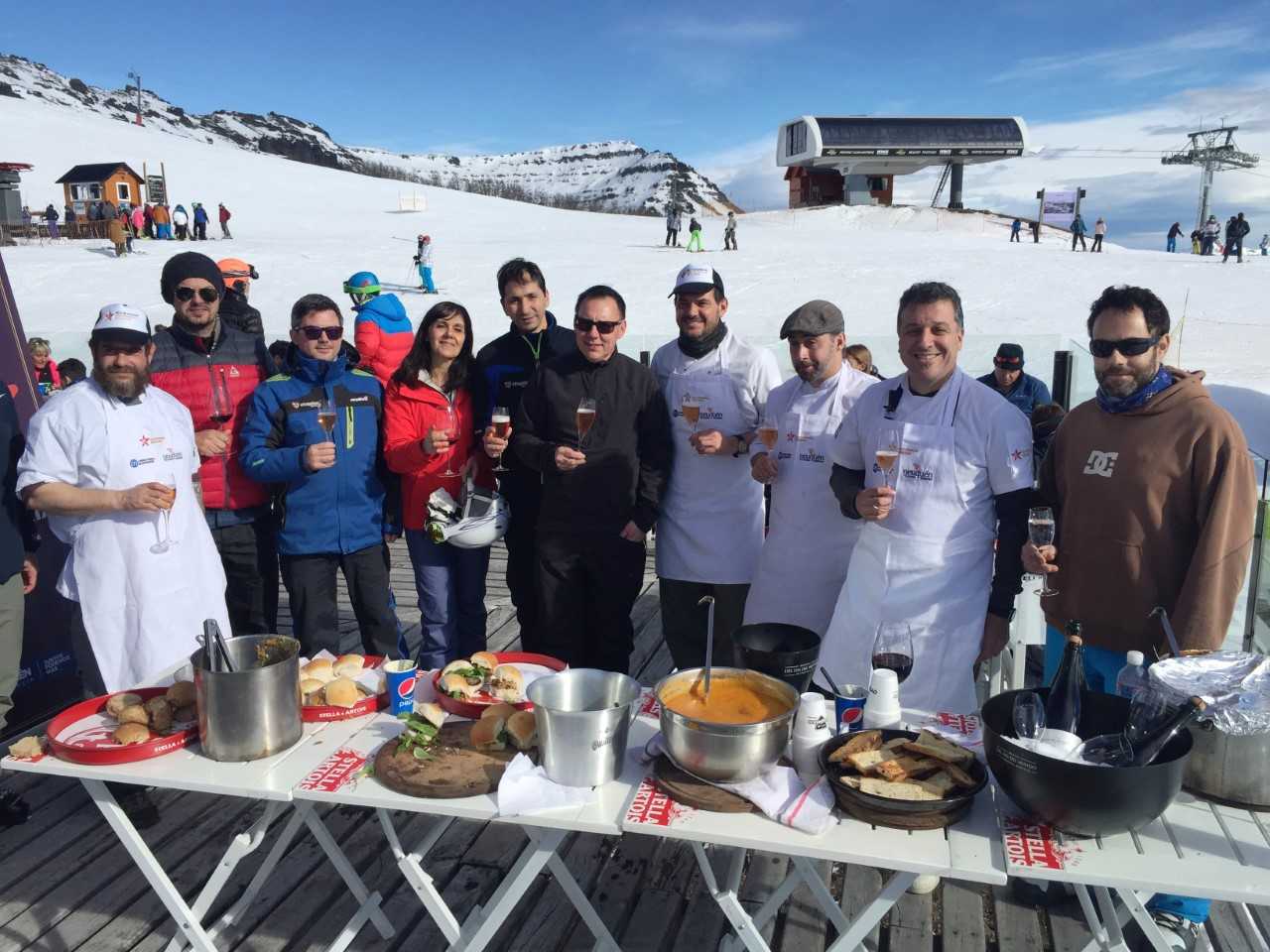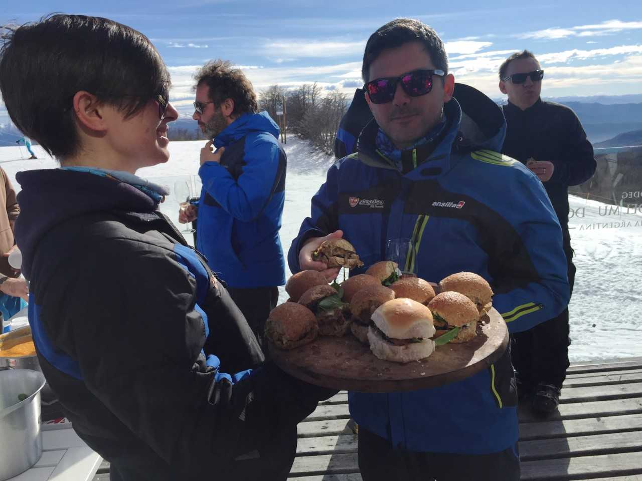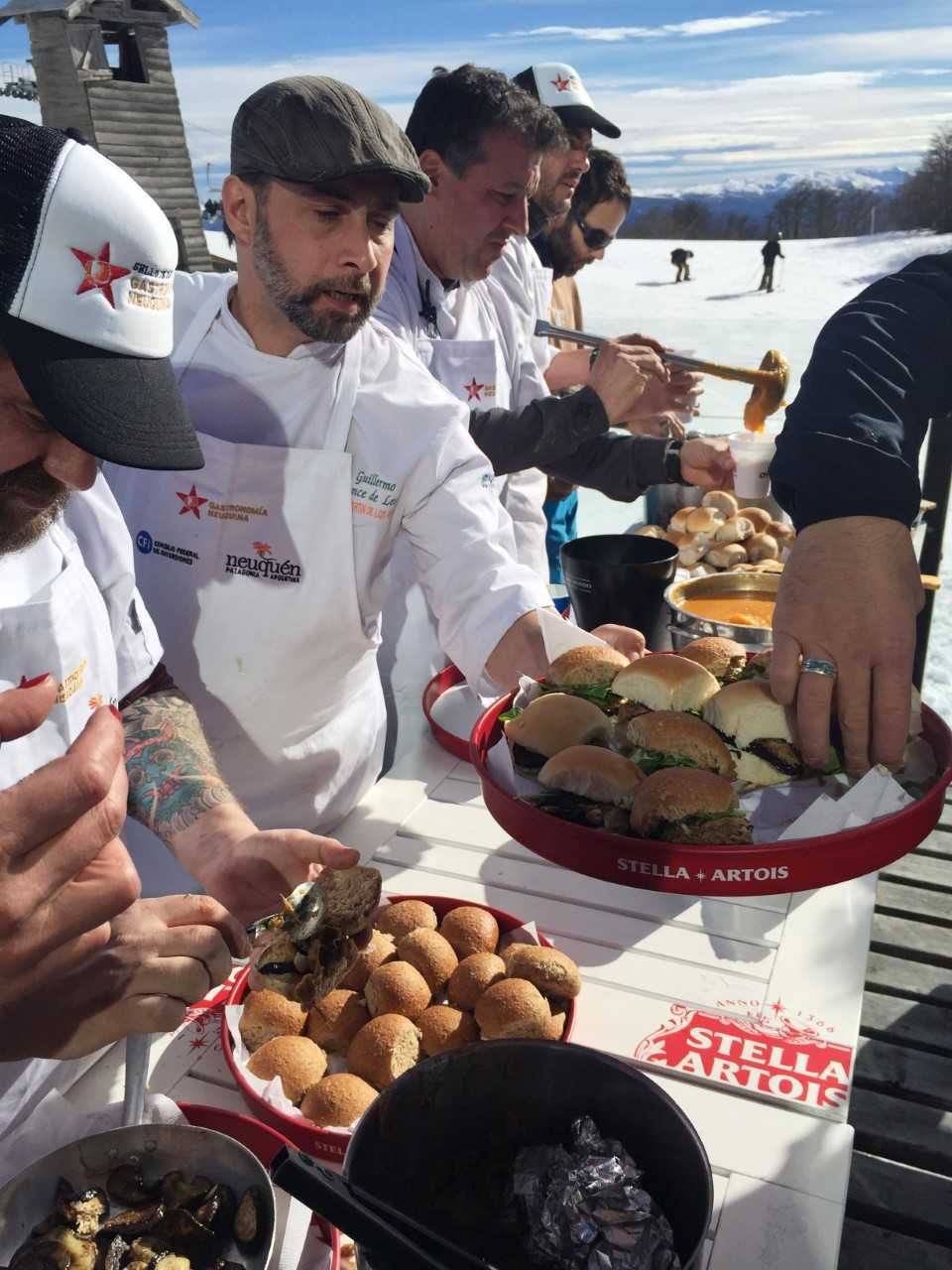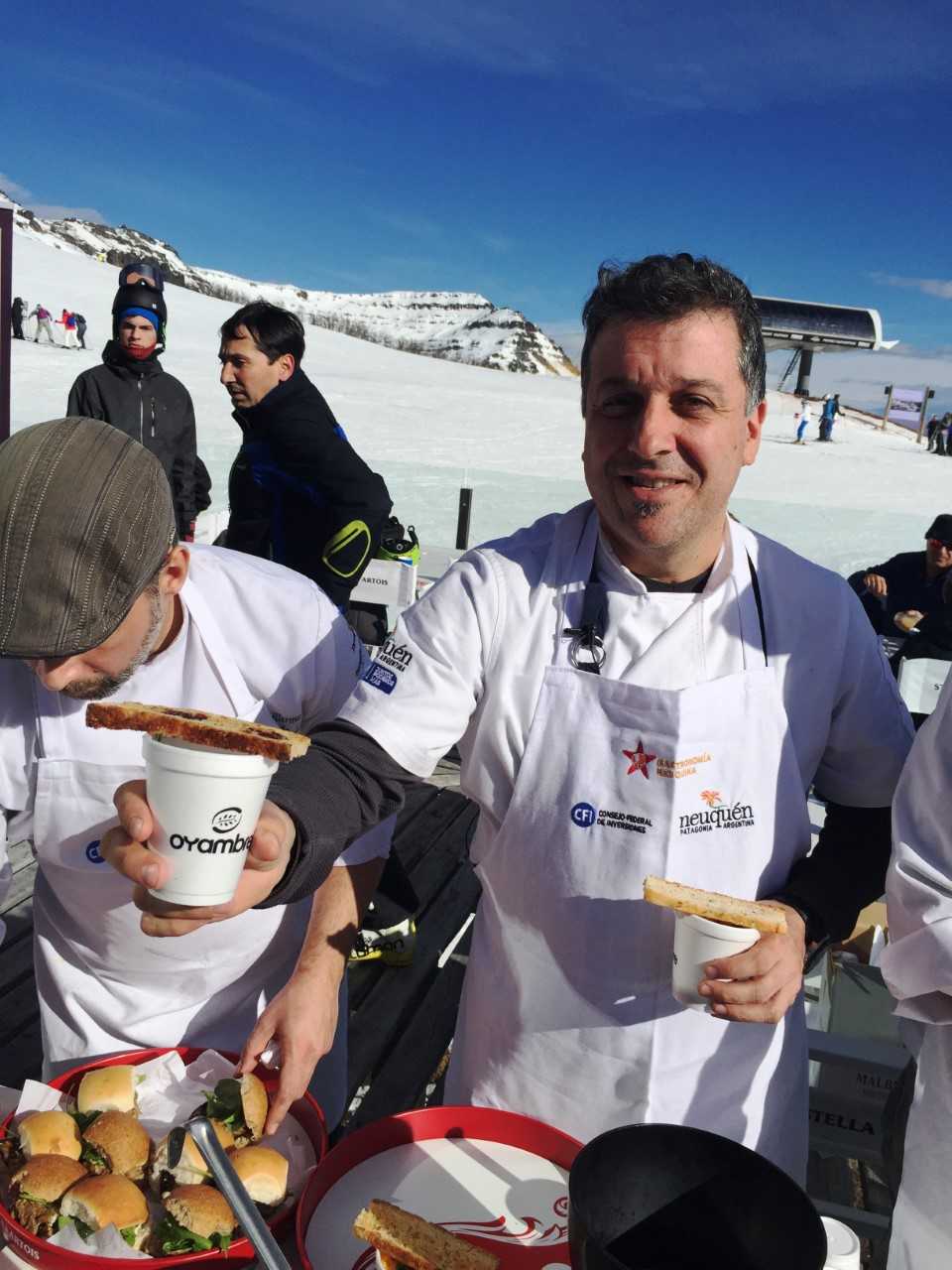 El chef Pablo Buzzo comanda una fiesta de la gastronomía neuquina en la nieve y sirve un guiso de ciervo a base de vegetales, hongos de pino, merken, miel y mostaza, exquisito e ideal para aquellos que buscan reponer calorías y seguir esquiando. La gente pasa, se sirve una copa de espumante, come, conversa, disfruta del entono maravilloso, se ríe, es feliz.
