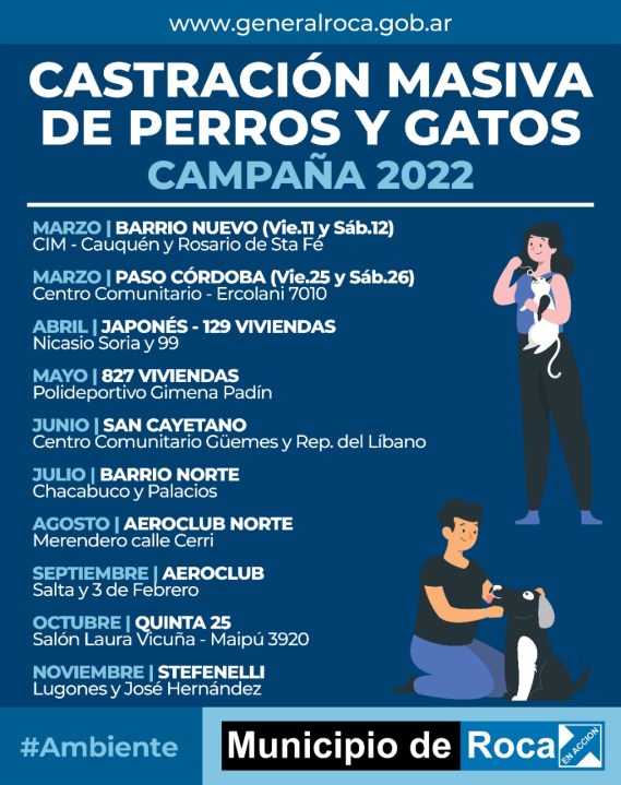 Es importante aclarar que durante los días en que se realicen las jornadas de castraciones masivas en Barrio Nuevo, estarán suspendidas todas las actividades que se vienen desarrollando en los barrios Noroeste y Alfonsina Storni. Las mismas se retomarán el lunes 14 de marzo.