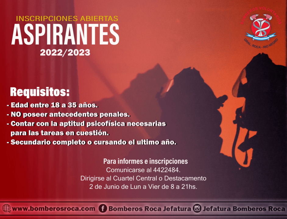 La Jefatura de Bomberos Voluntarios de Roca abrió las inscripciones para el curso de aspirantes que quieran pertenecer al Cuerpo activo. Este llamado estará destinado al período 2022-2023 y las vacantes son limitadas, contando con una serie de requisitos para postularse.