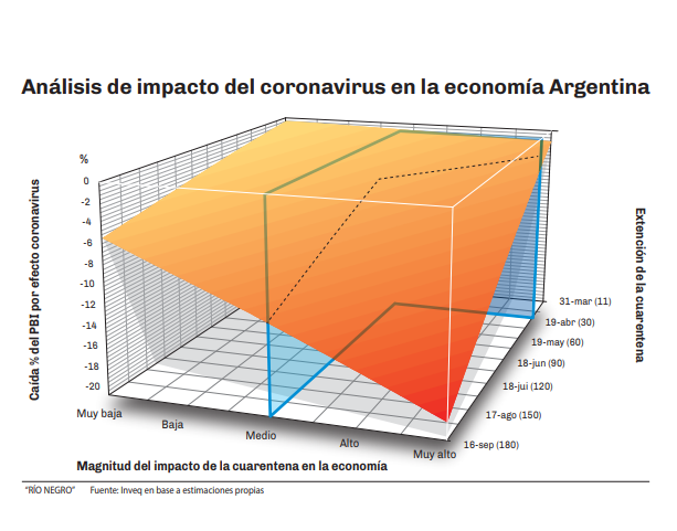 Un informe publicado por la consultora Invecq, traza los posibles escenarios en cuanto a la caída potencial, a medida que se extienda el confinamiento obligatorio. Los resultados se resumen en el gráfico que acompaña la nota, donde la altura indica el nivel de caída en el PBI, el eje horizontal muestra la magnitud del impacto, y la profundidad representa la extensión de la cuarentena.