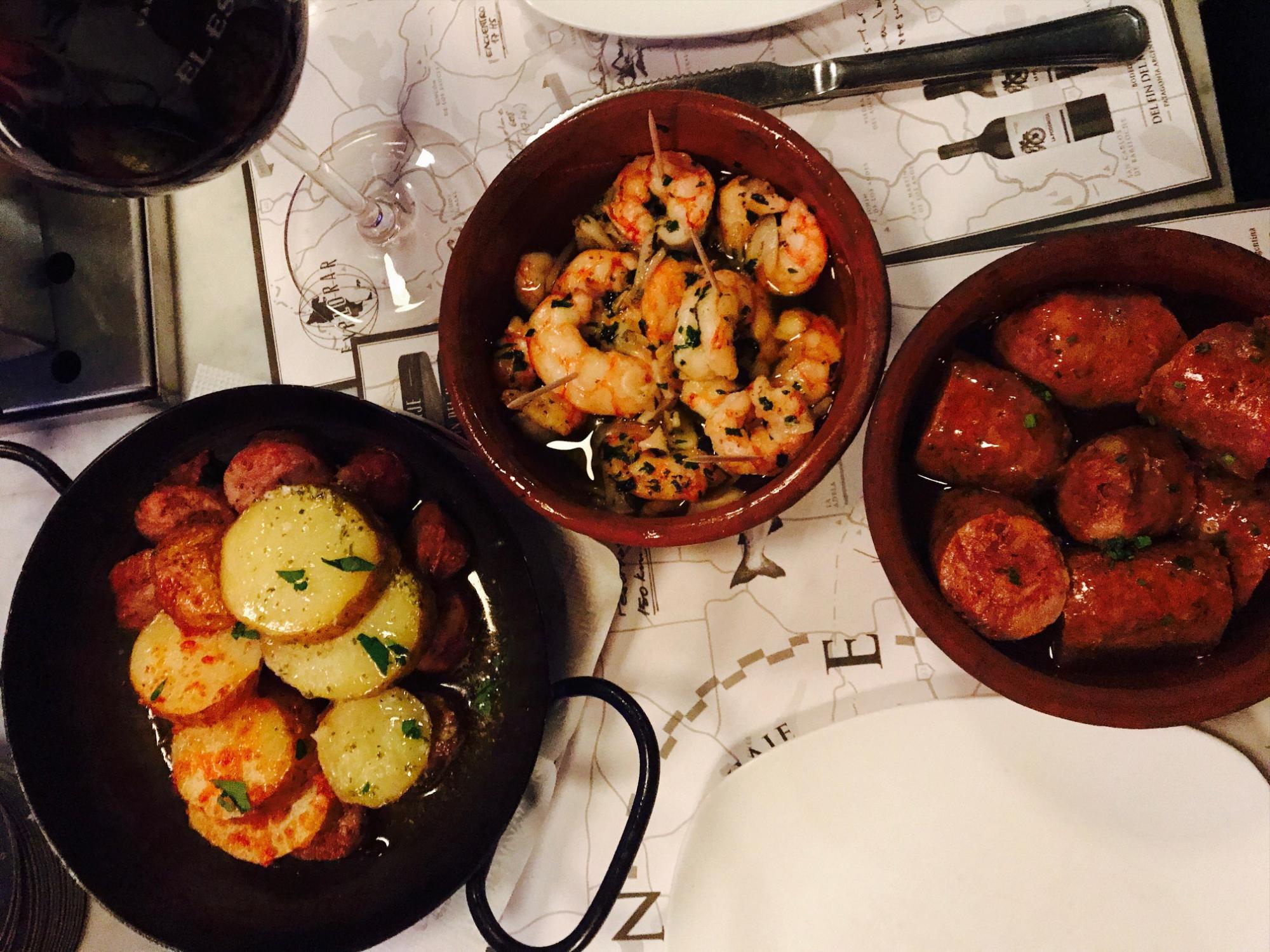 Recomiendo las papas arrugadas con chorizo y mojos canarios, las croquetas y los huevos rotos.
