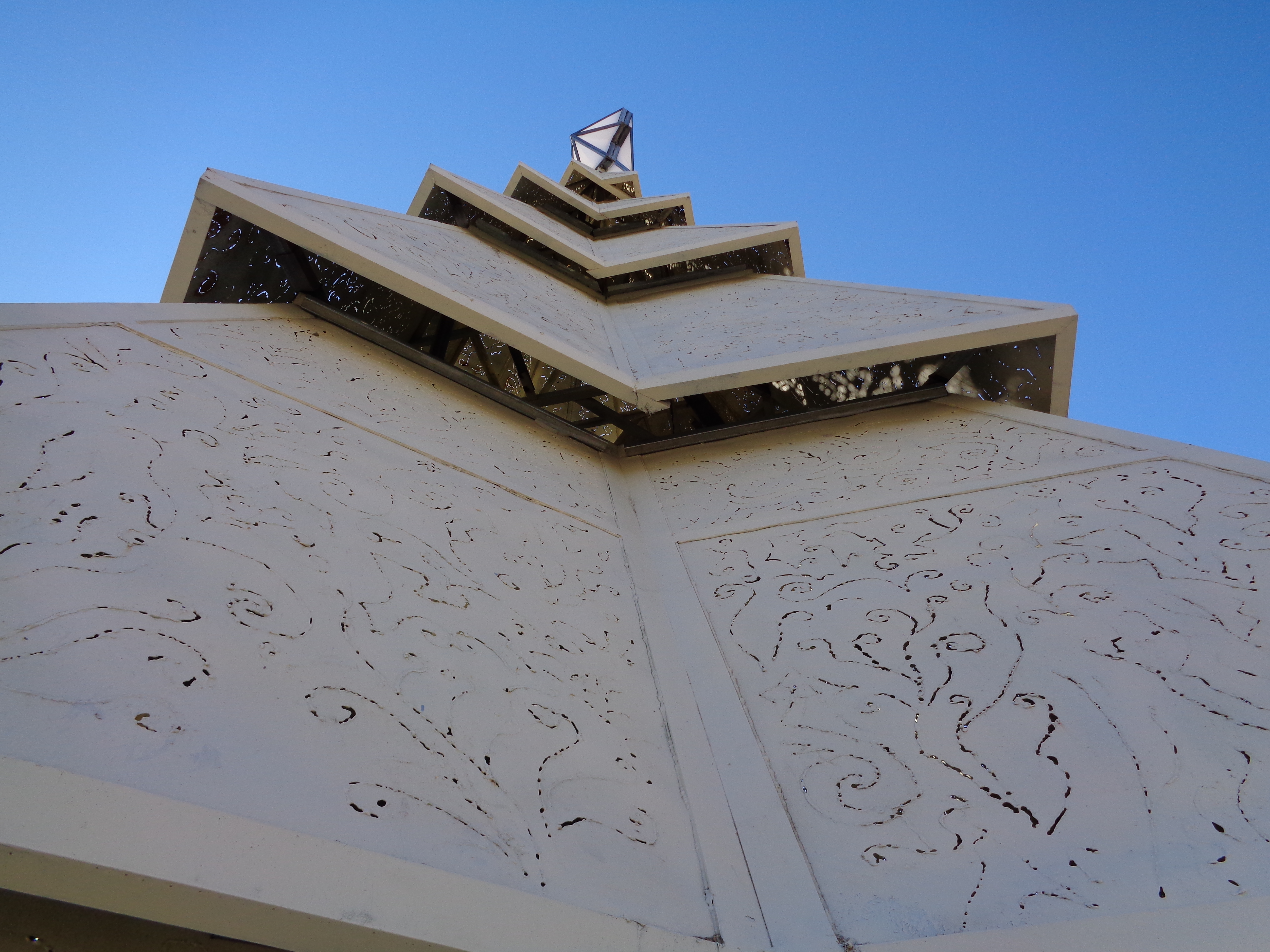 La estructura es totalmente metálica forrada en su exterior en chapa lisa, que fue calada en forma manual (filigranada) y que permite el paso de la iluminación desde su interior en la noche, creando reflejos, efectos escenográficos y detalles únicos.