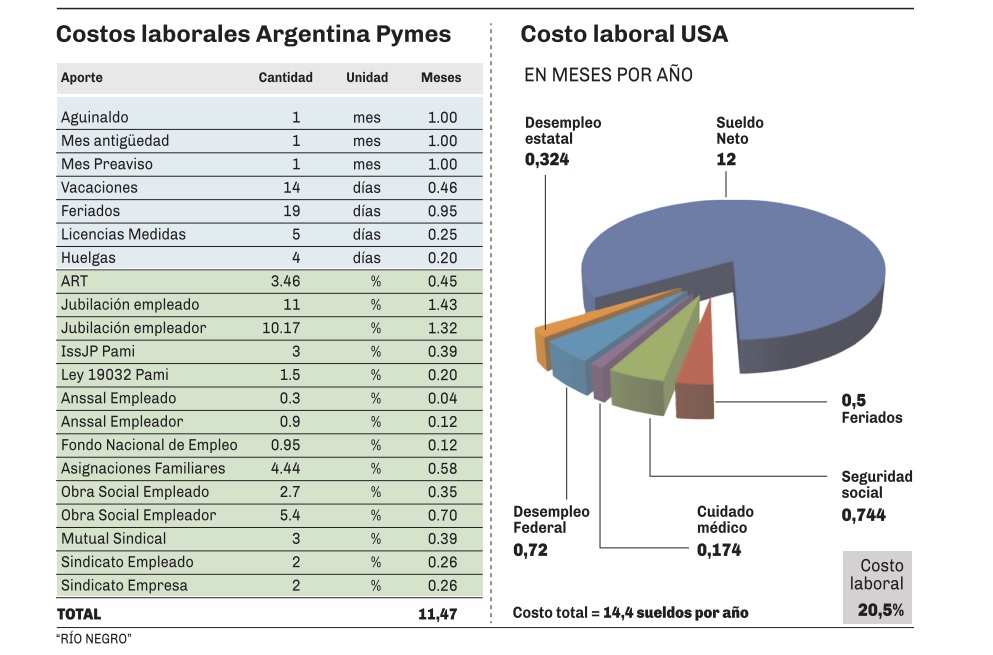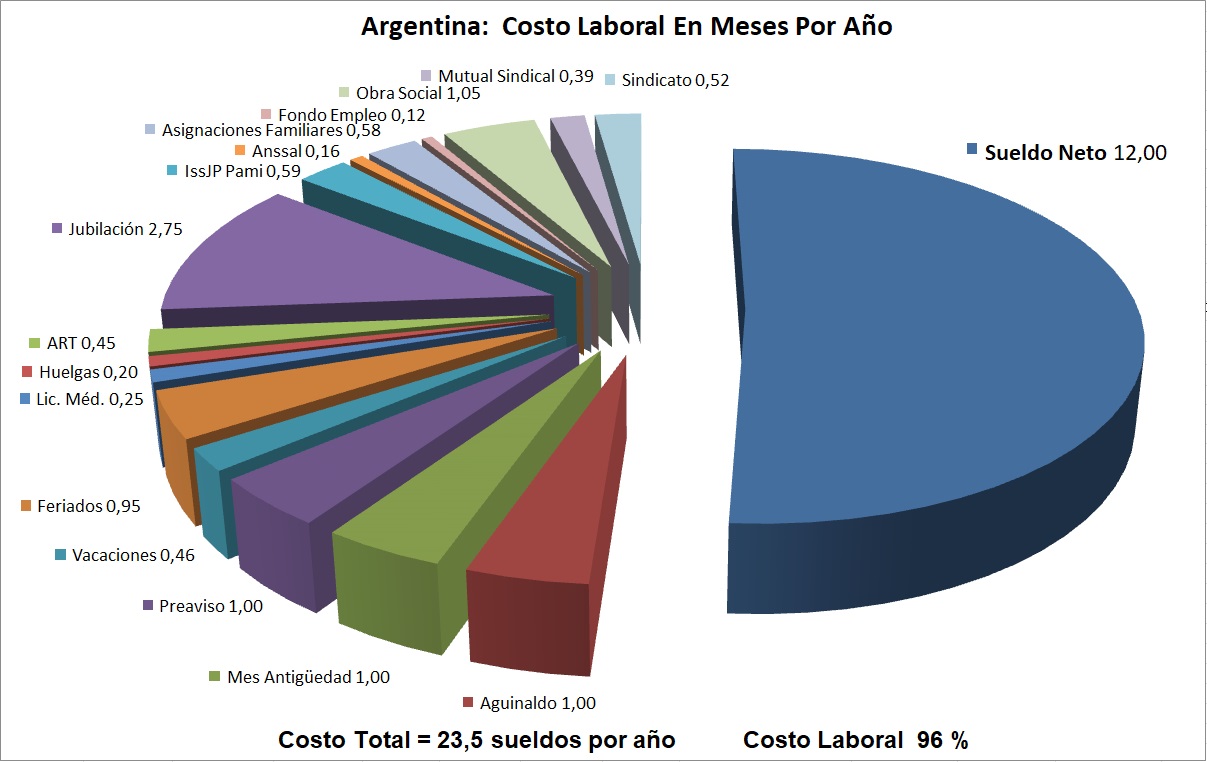 Sumados todos, equivalen a once meses y medio adicionales al sueldo neto mensual. Es decir deben afrontarse 23 sueldos y medio en lugar de doce.