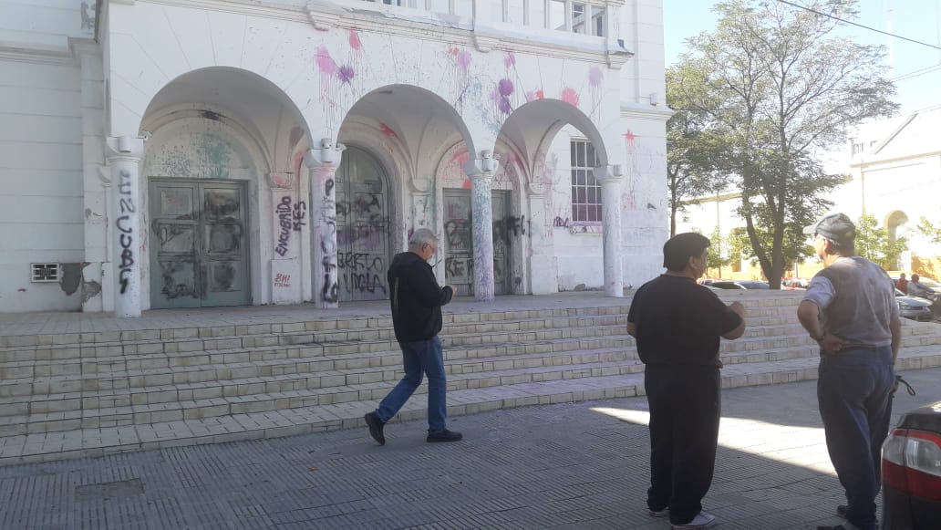 Cuando la marcha concluyó en el lugar, algunos miembros de la iglesia internaron frenar las pintadas y hasta terminaron retirando una bandera verde en contra del docente de Stefenelli denunciado en la justicia por varios casos de abuso de menores.