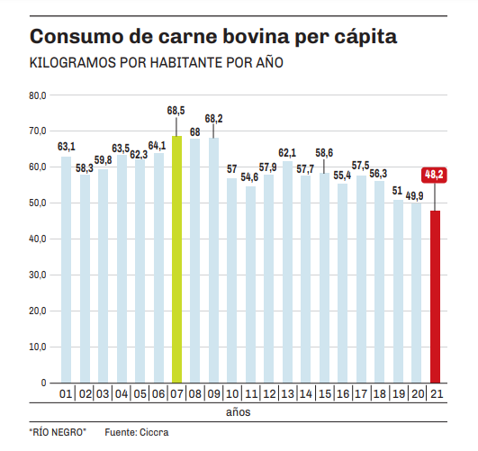 Hacia el año 2007, los argentinos consumían 68,5 Kg per cápita de carne vacuna al año. A fines de 2014, el registro ya se había reducido hasta los 58,6 Kg per cápita al año. En 2021, el consumo se estima en apenas 48,2 Kg per cápita anual. El consumo de carne vacuna se redujo un 30% en la última década y media.