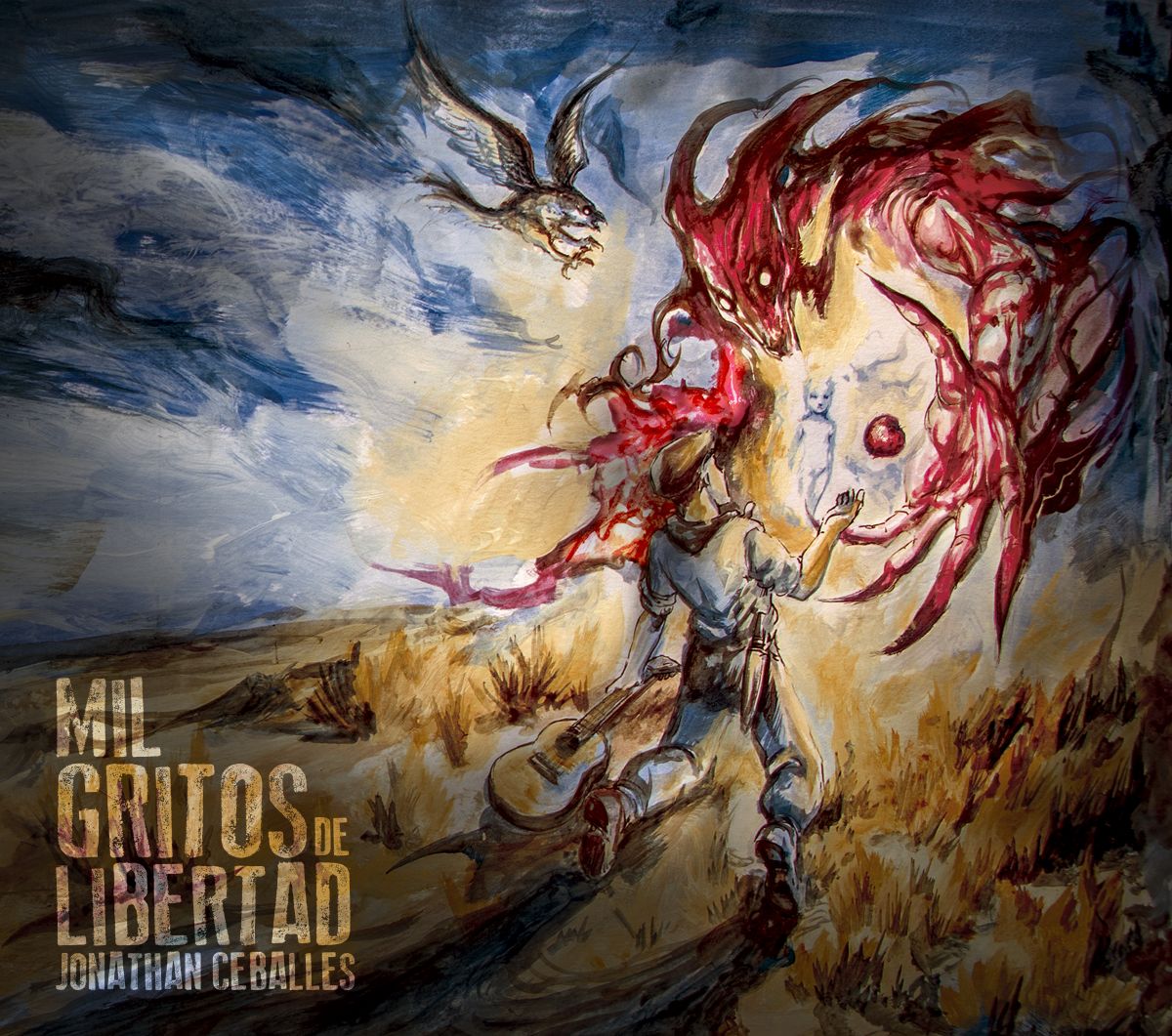 Abajo, la portada del último disco de Jonathan, Mil gritos de libertad: canciones de raíz folclórica con identidad regional, inspiradas en las vivencias y las leyendas del campo en los paisajes de la estepa patagónica. Cualquier parecido con La Pasión del Maruchito no es pura coincidencia.