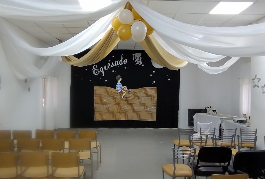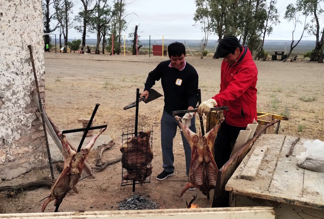 Volviendo a la celebración, terminada la perseverante labor de los asadores, se apilaron todas las sillas del salón de actos y allí mismo se ubicaron los tablones, gaseosas y vasos de colores, para recibir ese manjar tan sencillo y emblemático a la vez. “Es muy emotivo e inspirador, ya que somos pocos y los lazos son más fuertes, como una familia”, dijo la docente Valeria Herrera, a cargo de dictar Matemática, Lengua, Ciencias Sociales y Ciencias Naturales de 2° Plurigrado, o sea, “la seño de Agustín”. Según explicó en diálogo con RÍO NEGRO, si bien la casa de este preadolescente queda en Plaza Huincul, él “transitó toda su escuela primaria en Challacó, entonces fue un acto emotivo, porque dejó su huella en la institución. A su vez, la mamá, Javiela Molina, es una de nuestras auxiliares de servicio hace 18 años. Ese día lo acompañaron con su papá Juan Leiva y el resto de sus seres queridos”, valoró la maestra.