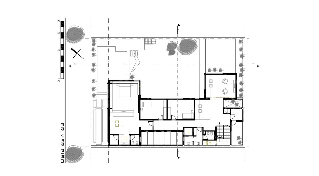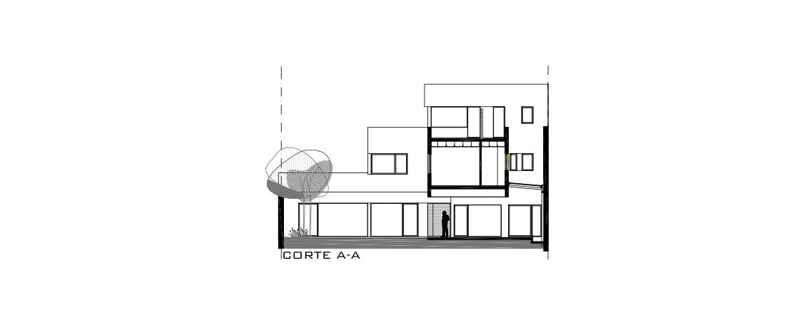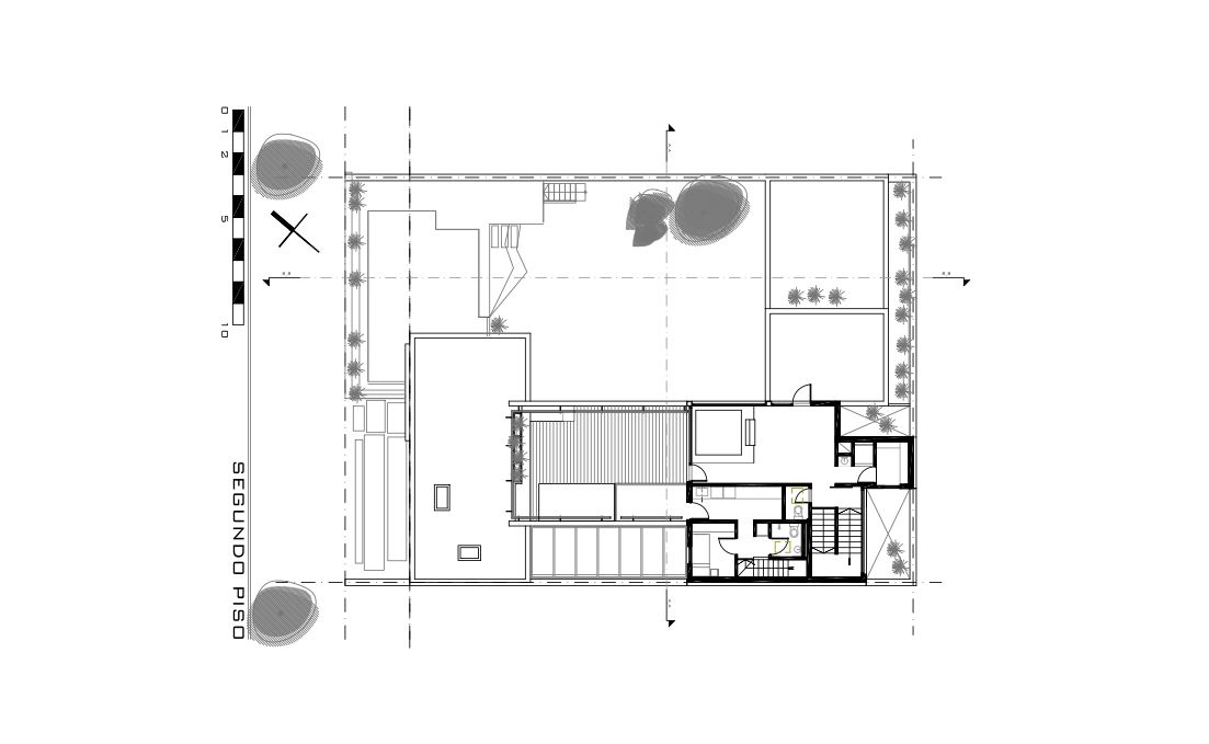 Por esta razón el planteo se apoya en las construcciones vecinas existentes, dándoles la espalda, en una postura introspectiva donde las vistas y el paisaje se generan en el propio interior del lote y no hacia afuera. Una arquitectura que supo generar su propio paisaje. De esta manera se logró resolver la premisa de las visuales y el asoleamiento en el jardín, una preocupación planteada por los clientes desde un primer momento.