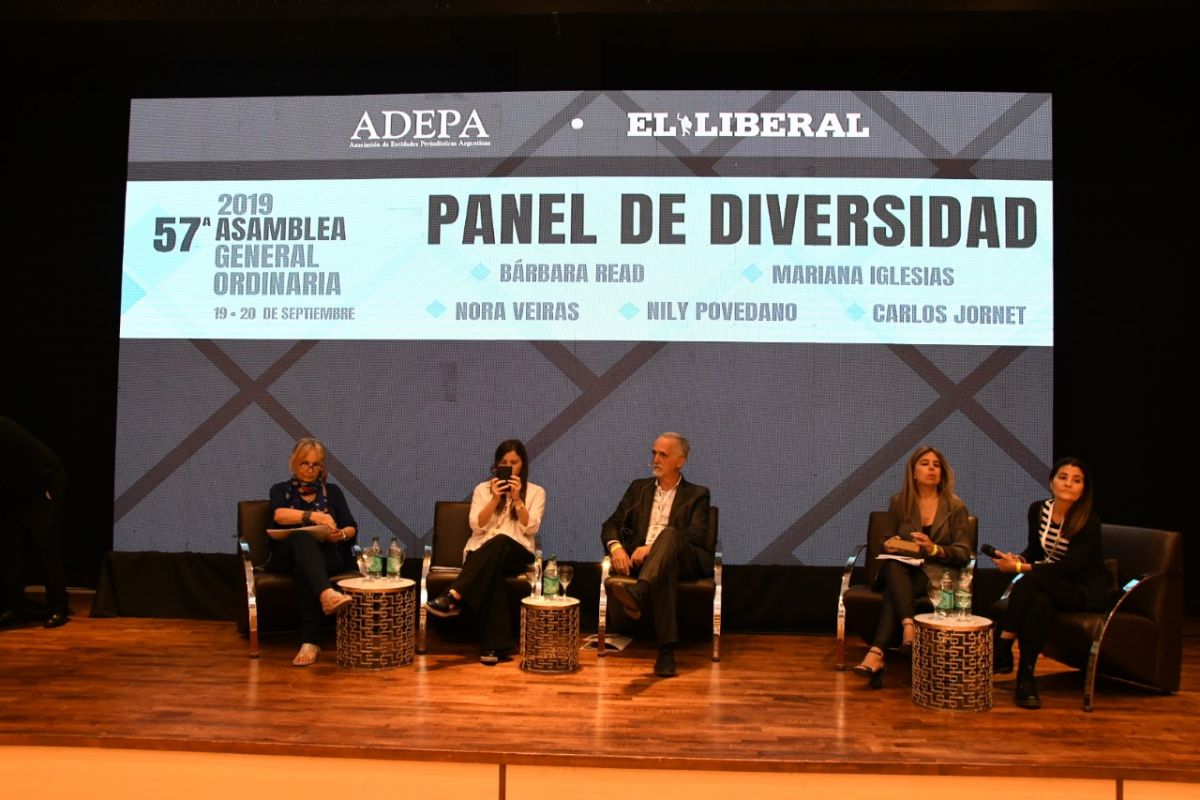Al cierre de la primera jornada de la Asamblea de Adepa, se realizó un panel sobre políticas de diversidad en los medios, donde participaron Nidia Povedano, vicepresidenta de ADEPA y accionista de «Río Negro», Bárbara Read, subdirectora de «La Mañana», de Formosa; «Nora Veiras», directora de Página 12; «Mariana Iglesias», editora de género del diario Clarín; y «Carlos Jornet», director periodístico de La Voz del Interior, de Córdoba.