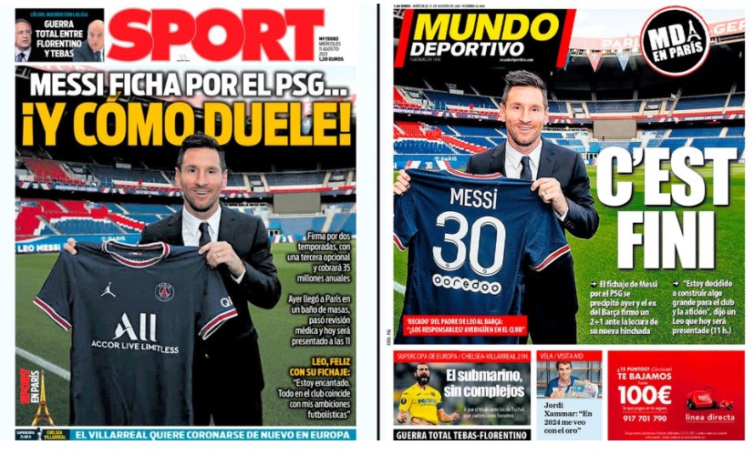 «Messi ficha por el PSG, ¡y cómo duele!«, fue el título de la edición impresa del diario deportivo Sport ya en el miércoles europeo.