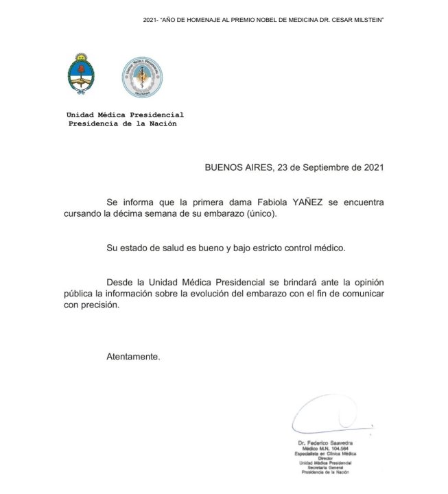 La Unidad Médica Presidencial confirmó esta tarde el embarazo de Fabiola Yañez, primera dama de la Nación, por lo que junto al presidente Alberto Fernández se convertirán en padres el año próximo.