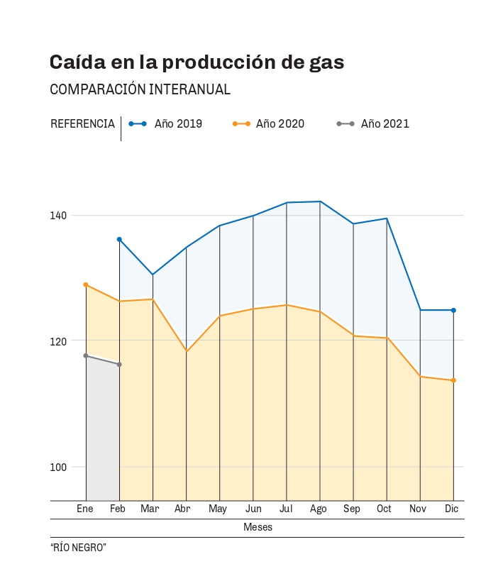 Esta caída que viene registrándose en el sector es tal que en febrero de este año, los 114,52 millones de metros cúbicos de gas natural que por día se generaron contrastan no solo con los 127,71 que se habían extraído en el mismo mes del 2020, sino en especial con los 134,66 millones de metros cúbicos que se generaron en febrero de 2019.