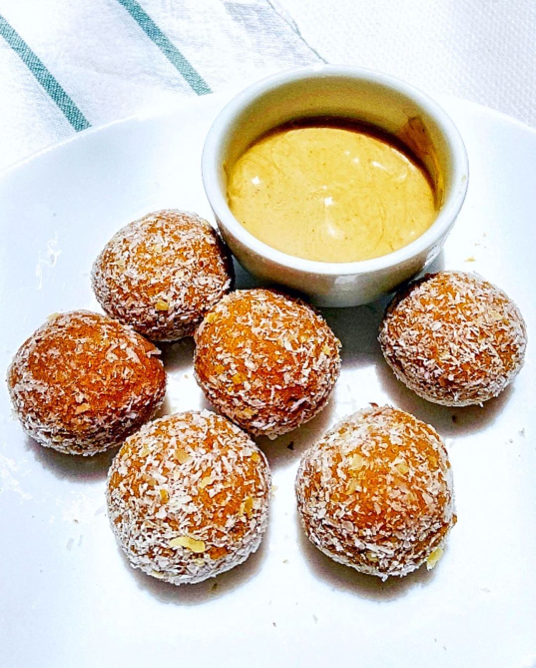 Procesar todos los ingredientes y formar bolitas con la manos (humedecé tus manos así no se te pega la mezcla). Pasar por coco rallado, llevar un par de horas a la heladera y listo. Yo las acompañé con más mantequilla de maní.