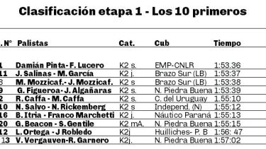 Damián Pinta (que esta vez no corre con su padre Néstor), ganador el año pasado, comenzó de la mejor manera la defensa del título. Esta vez acompañado por otro joven talento del agua como Facundo Lucero, la dupla que representa a la Escuela Municipal de Patagones y el Club Náutico La Ribera, prevaleció en el sprint final sobre cuatro embarcaciones y se quedó con el primer parcial.