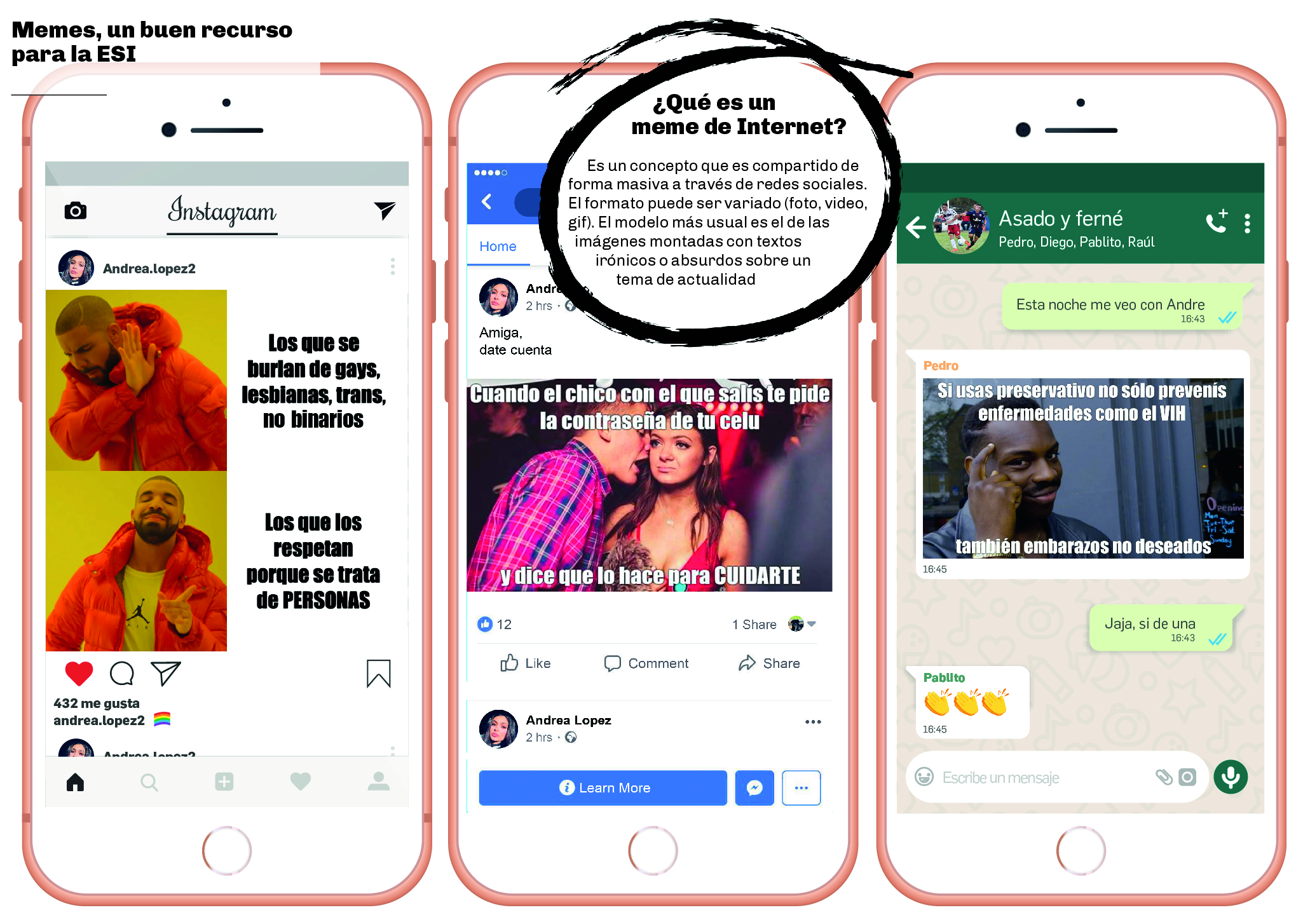 El material de ESI incluye cuadernillos, folletería y láminas elaboradas desde el ministerio de Educación de Nación y de provincia. Algunos profesores del secundario incorporan nuevas herramientas para hacer más atractivos los contenidos como los memes de Internet, que suelen ser imágenes con mensajes irónicos. “ESI, ESI everywhere (en todos lados)”, le diría Buzz Lay Year a Woody, los personajes de la película Toy Story, en un diálogo que se hizo viral.