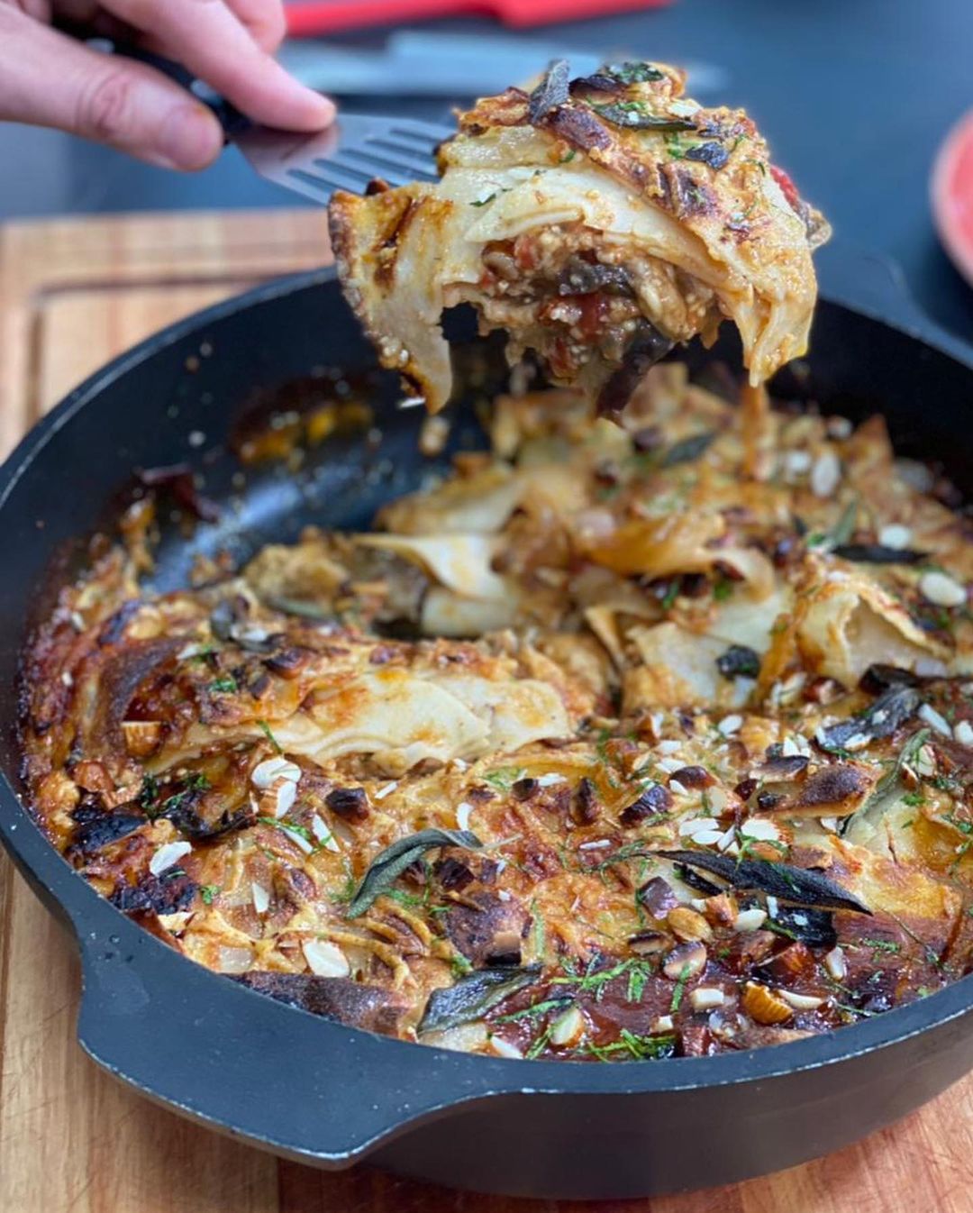 Triture las almendras hasta que estén finas y mezcle las hojas de salvia restantes con aceite, luego espolvoree por encima. Use el dorso de una cuchara para crear efecto olas en la superficie, y hornee por 25 minutos, o hasta que esté dorado y burbujeante. Servir con una ensalada de verdes crujientes aderezada con vinagre balsámico.