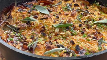 Triture las almendras hasta que estén finas y mezcle las hojas de salvia restantes con aceite, luego espolvoree por encima. Use el dorso de una cuchara para crear efecto olas en la superficie, y hornee por 25 minutos, o hasta que esté dorado y burbujeante. Servir con una ensalada de verdes crujientes aderezada con vinagre balsámico.