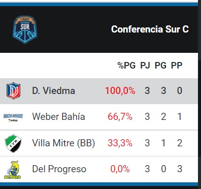 Deportivo Viedma manda en la Conferencia Sur C, donde logró victorias ante los dos equipos de Bahía y Del Progreso en el comienzo del certamen. Por su parte, el Auriazul de Roca no pudo ganar ningún juego y hasta ahora es el peor de los cuatro que integran el grupo, por lo que necesita su primer triunfo.