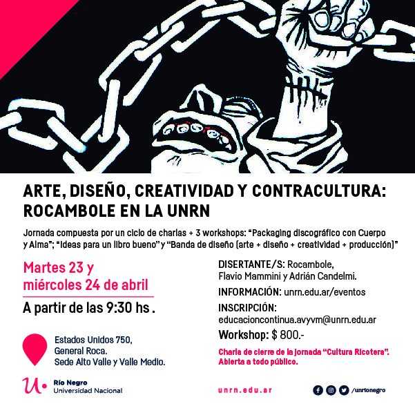 l “Arte, diseño, creatividad y contracultura: Rocambole en la Universidad Nacional de Río Negro” es el primer acercamiento en una universidad de la Patagonia, al protagonista fundamental de la cultura visual de una de las bandas de rock más importantes de nuestro país y Sudamérica: el artista y diseñador Rocambole, creador de toda la obra gráfica que acompañó durante su existencia a “Patricio Rey y sus Redonditos de Ricota”. Serán dos jornadas históricas; martes 23 y miércoles 24 de abril en el edificio académico de la UNRN en General Roca, ubicado en Estados Unidos 750.