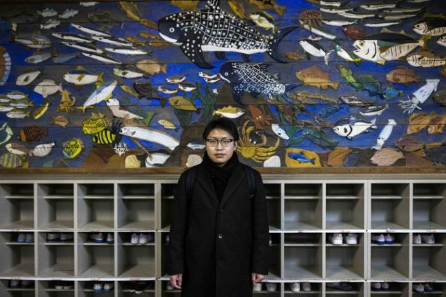 Yuto Naganuma mira ensimismado mientras la helada brisa del mar sopla por encima de las paredes destruidas del colegio donde perdió a su hermano pequeño en el devastador tsunami del 2011 en Japón.