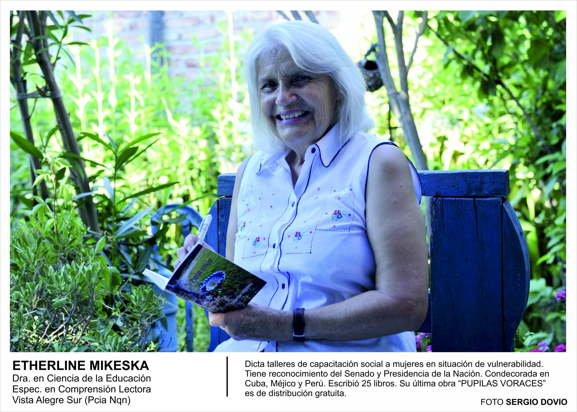 Etherline comenzó a escribir a los 9 años y en el afán de trasmitir y de generar cultura no ha abandonado la tarea hasta ahora. Son 25 libros que ha escrito, el último de los cuales PUPILAS VORACES, obtuvo una gran repercusión y fue reconocido como de interés cultural por la Subsecretaría de Cultura y la Legislatura de Neuquén. Aquí transforma la metáfora elaborada de otros libros, en lenguaje coloquial, sencillo y denunciativo para contribuir a la denuncia del flagelo de la violencia de género, infancia y trata de personas.