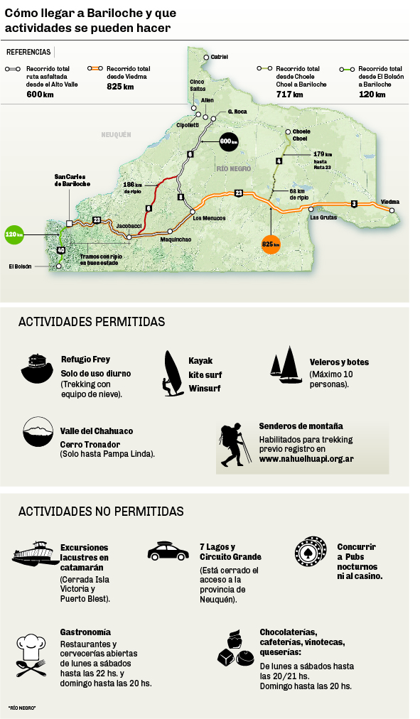 Una vez en la ciudad, las opciones para disfrutar también se limitan en comparación con la amplia variedad de los tiempos prepandemia. Ahora no estará habilitado el esquí en el cerro Catedral ni los parques de nieve del cerro Otto. Tampoco las excursiones lacustres en catamarán, ni las terrestres interprovinciales como 7 Lagos o Circuito Grande.