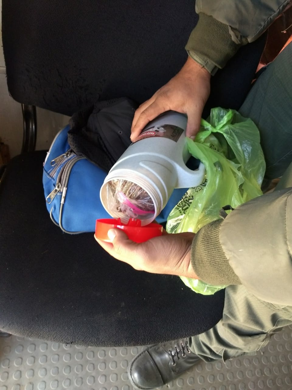En una requisa de Gendamería, llamó la atención el peso del termo. Al abrirlo, encontraron paquetes con marihuana. Dos personas están detenidas.