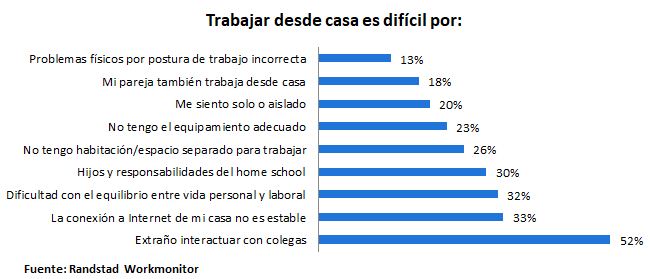 Otros motivos por los cuáles resulta difícil trabajar desde casa señalados por los participantes de la encuesta son: contar con una conexión inestable a internet (33%); la dificultad para mantener el equilibrio entre vida personal y laboral (32%); el home school de los hijos y la sobrecarga de tareas que esto conlleva (30%); no contar con un espacio separado para trabajar (26%); no tener el equipamiento adecuado (23%); sentirse solo o aislado (20%); trabajar en casa también con la pareja (18%); tener problemas físicos debido a una postura de trabajo incorrecta (13%).