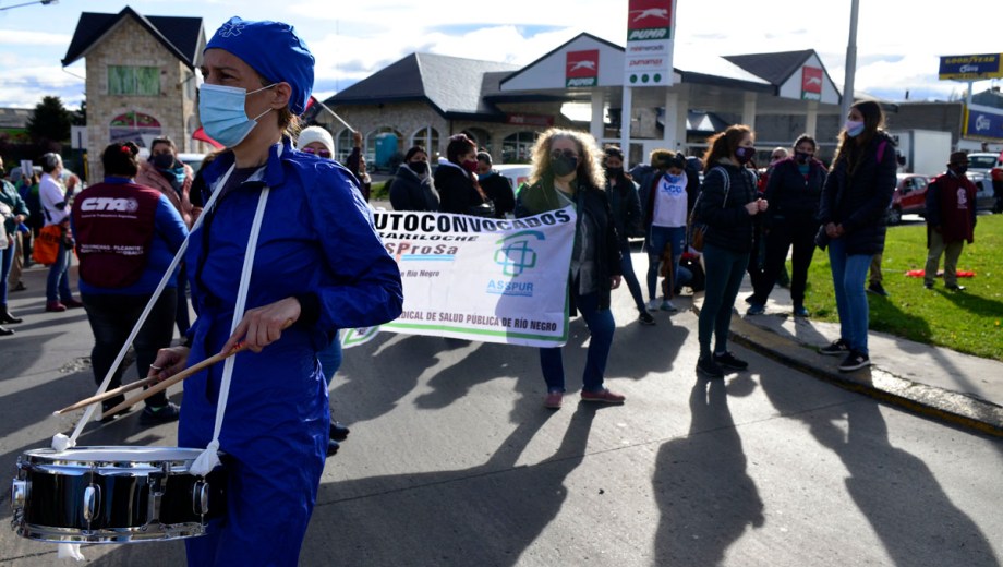 Dos carteles gigantes en los que se leía "Salud en lucha" y "Acá, todos relajados en la lucha de sueldos dignos" encabezaron la marcha de unos 200 trabajadores de la salud hasta la rotonda del Ñireco, a unos dos kilómetros del centro de Bariloche, donde realizaron cortes de tránsito intermitentes.