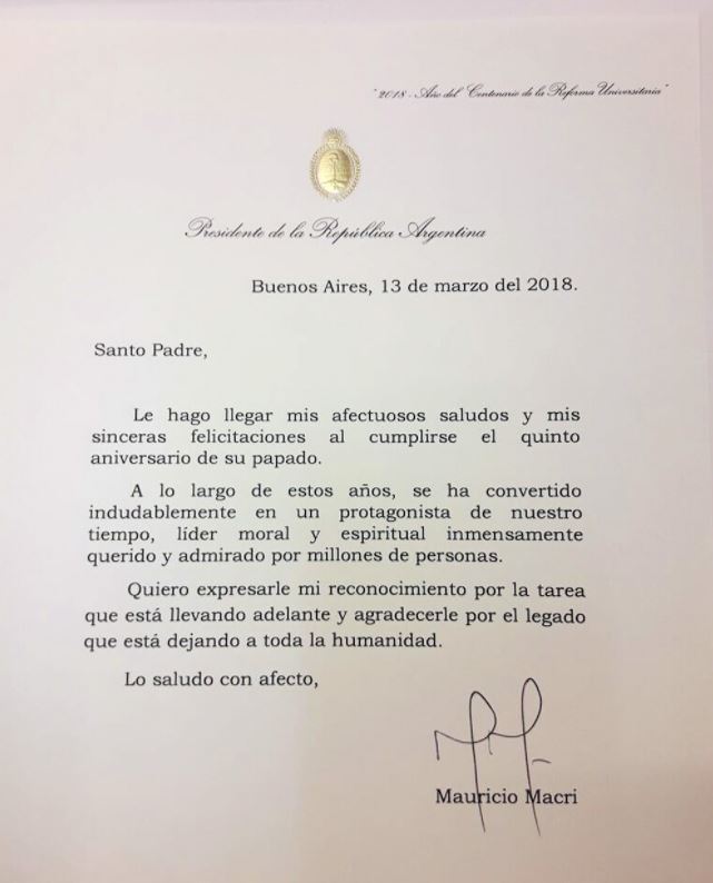 “A lo largo de estos años, se ha convertido indudablemente en un protagonista de nuestro tiempo, líder moral y espiritual inmensamente querido y admirado por millones de personas”, agregó Macri en la misiva que lleva su firma de puño y letra.