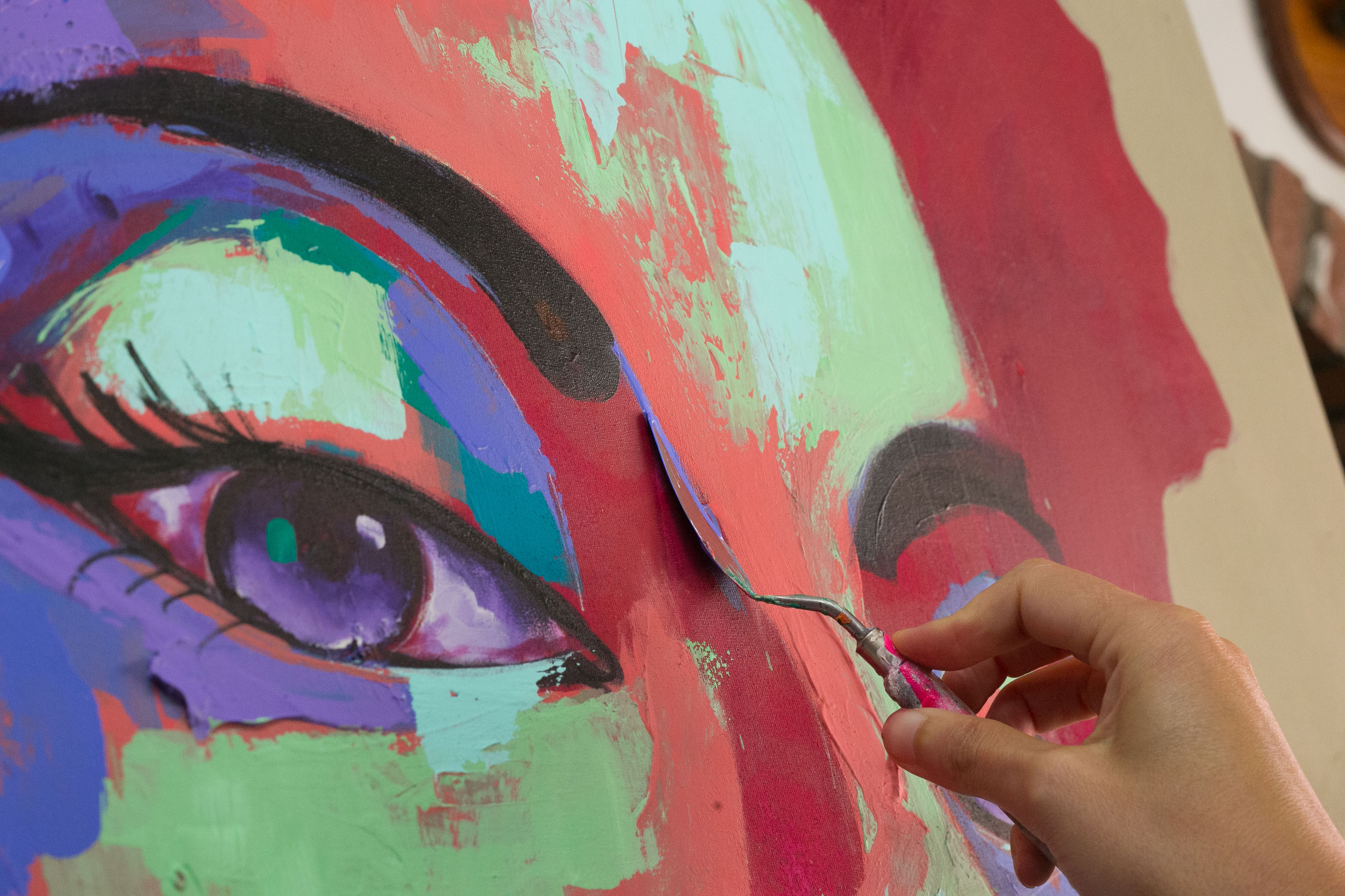 R: Por lo general parto de una macha de uno o más colores y de la relación entre ellos es que va tomando forma cuando se trata de la representación de algo figurativo como un rostro.