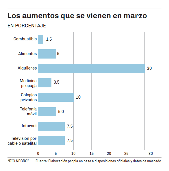 Se aprecia así que por ejemplo un abono de televisión satelital que hasta febrero costaba $3.000, desde marzo costará $3.225, el servicio de internet de banda ancha pasará de $2.500 a $2.668, y el costo de mantener dos celulares de $4.000 a $4.200. En la misma línea, la cuota educativa para dos hijos pasará de $20.000 a $22.000 y el plan familiar de medicina prepaga, de $18.000 a $18.630. Pero sin duda el impacto mayor llega de la mano del aumento del alquiler. Una familia que hasta marzo paga $25.000, muy probablemente deba enfrentar desde abril un alquiler de al menos $32.500.