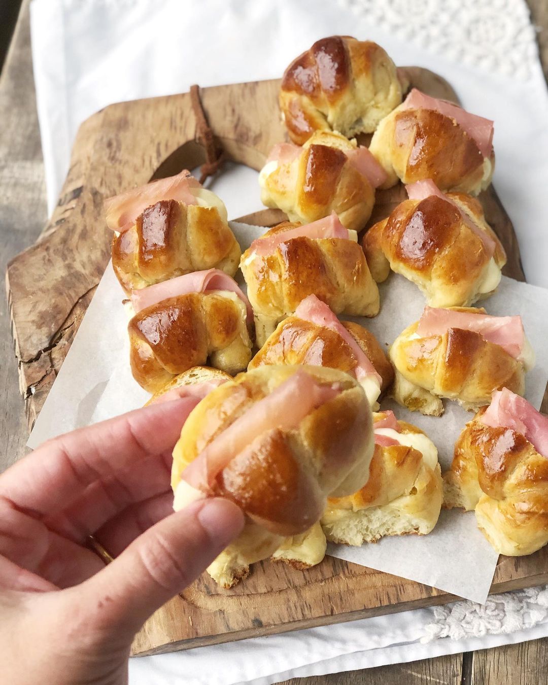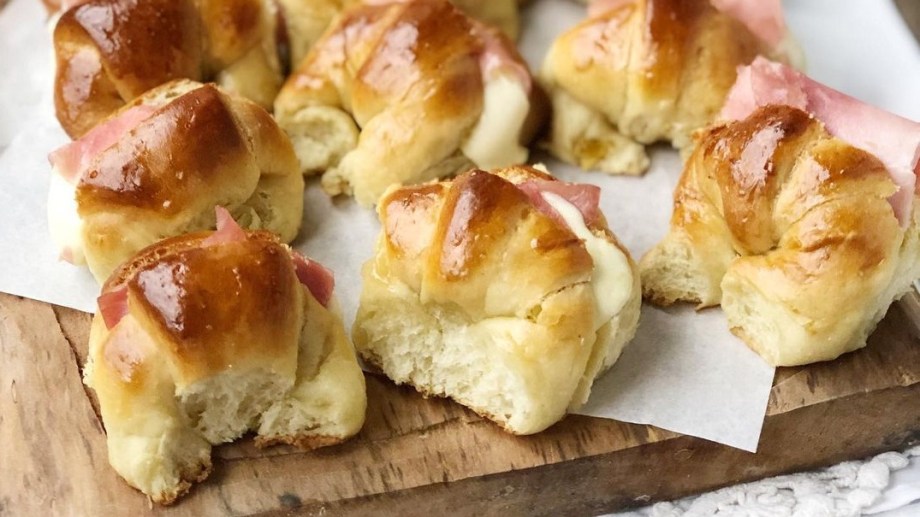 10. Al sacar las medialunas pincelarlas con bastante almíbar (almíbar? hervir partes iguales de agua y azúcar). Esto le da más sabor y brillo. La masa no es muy dulce, esto es fundamental. Ponele jamón y queso, llévalas al horno y a disfrutar!