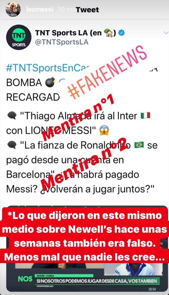 Con el rótulo de “mentira n°1”, “mentira n°2” y “fake news” señaló como falsas dos aseveraciones. La primera, que él y Thiago Almada jugarían en Inter y la segunda que sugería una intervención del Barcelona en la fianza de Ronaldinho para salir de la cárcel en Paraguay.