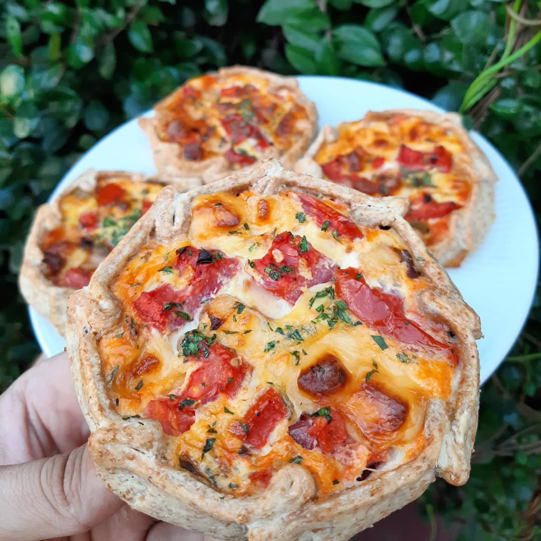 Mini tartas de queso, albahaca y tomate