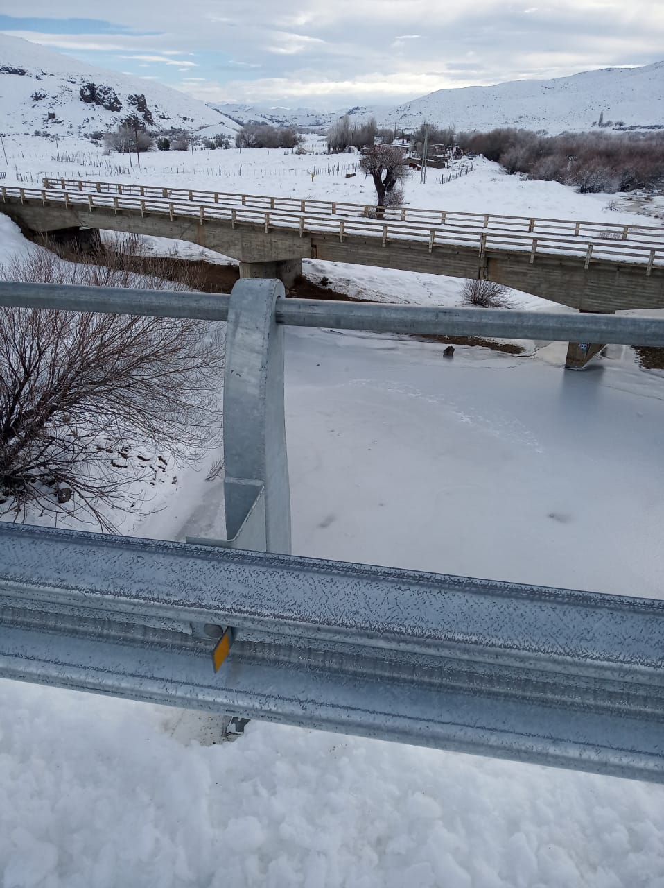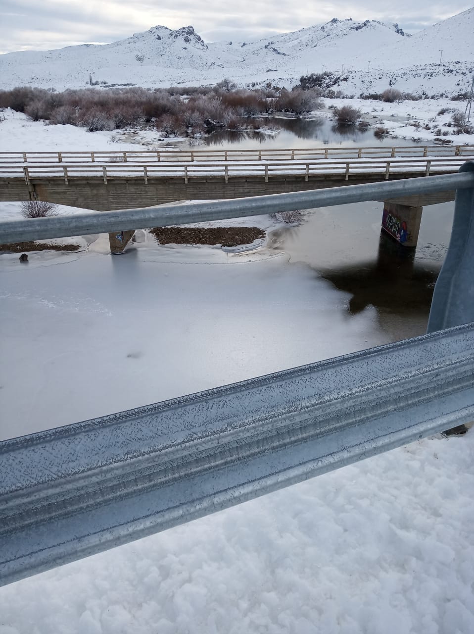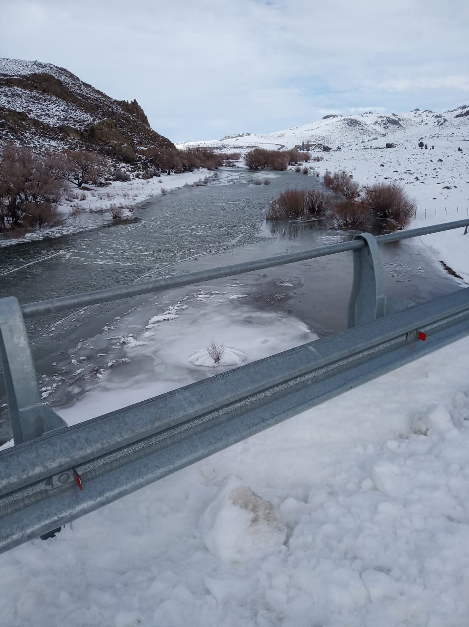 Por estos días hay más de 40 cm de nieve acumulada en los alrededores del puente. Hay que circular con mucha precaución en la Ruta Nacional 23: hay barro en los tramos de tierra entre Jacobacci y Bariloche. Y en el asfalto, las heladas matinales complican a los conductores.