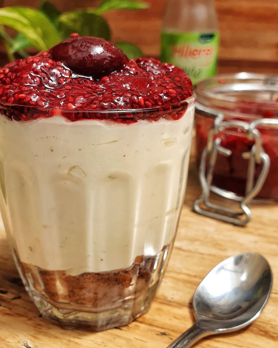 Molés 2 o 3 galletitas sin azúcar y las ponés en un vasito, yo estoy usando de chocolate, pero podés usar las que tengas o sustituirlas por budín, etc. En un bol mezclás unas 3 cucharadas de queso crema, 1 cucharadita de edulcorante y un poco de ralladura de limón o apenitas esencia de vainilla. Llenás el vaso, lo completas con mermelada de cerezas o de frutos rojos y listo para disfrutar.