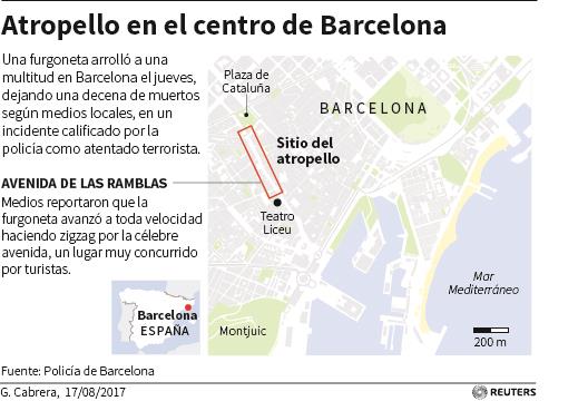 Una camioneta atropelló a varias personas en la histórica zona de Las Ramblas en Barcelona, dejando por lo menos 13 muertos y 50 heridos el jueves, informó el ministro del interior de la región.