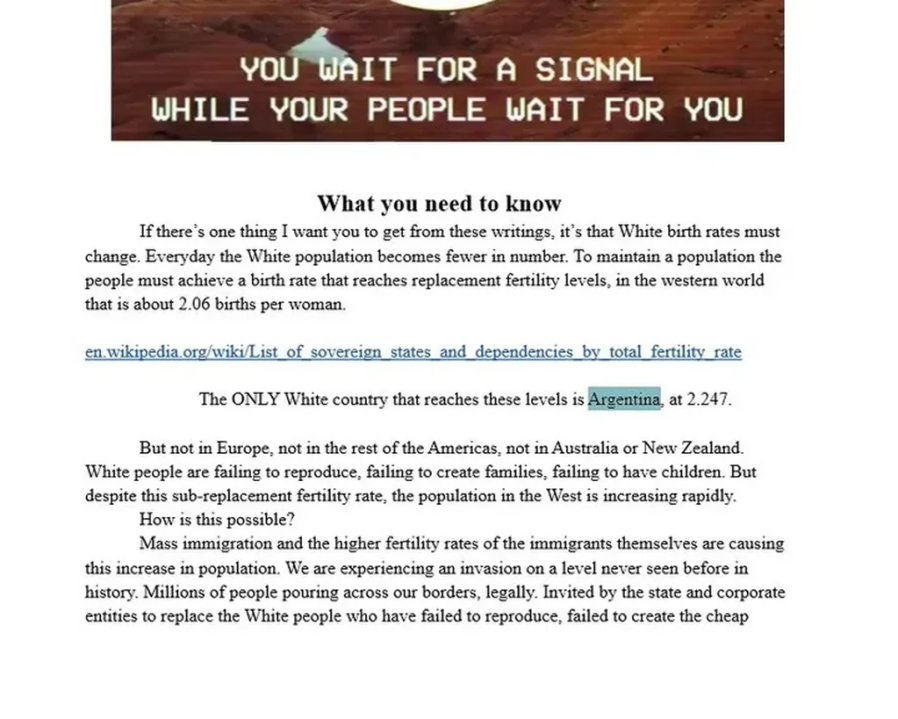 “Si hay algo que quiero que entiendas de estos escritos, es que las tasas de natalidad de los blancos deben cambiar. Cada día la población blanca se vuelve menor en número”, dice el documento. “Para mantener una población, la gente debe lograr una tasa de natalidad que alcance los niveles de fertilidad de reemplazo, en el mundo occidental, que es de aproximadamente 2,06 nacimientos por mujer”, agregó.